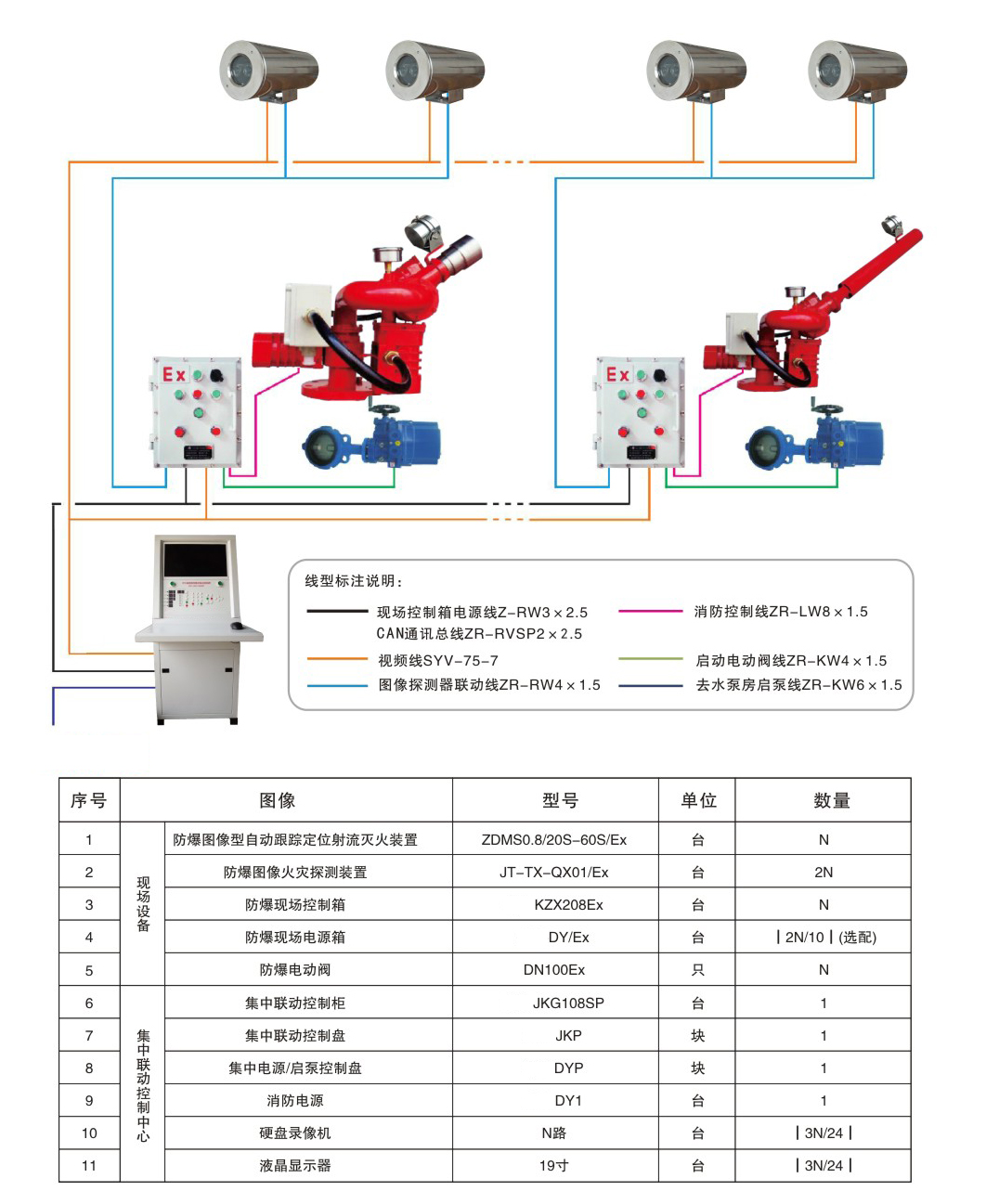 圖像型自動跟蹤定位射流滅火系統(tǒng)將圖像安全監(jiān)控和火災(zāi)探測系統(tǒng)、圖像定位系統(tǒng)有效的結(jié)合,并采用國際標(biāo)準(zhǔn)工業(yè)控制局域網(wǎng)總線制,能全天侯的自動監(jiān)控被保護(hù)區(qū)域,一旦發(fā)生火災(zāi),水炮立即啟動,迅速對火源進(jìn)行水平方向和垂直方向的智能掃描,確定火源的水平和垂直坐標(biāo),中央控制器發(fā)生指令,發(fā)出火警信號,同時(shí)啟動水泵、打開閥門,消防水炮對準(zhǔn)火源進(jìn)行噴水滅火,火源撲滅后,中央控制器再發(fā)出指令停止射水。若有新的火源,水炮將重復(fù)上述過程,待全部火源被撲滅后重新回到監(jiān)控狀態(tài)。