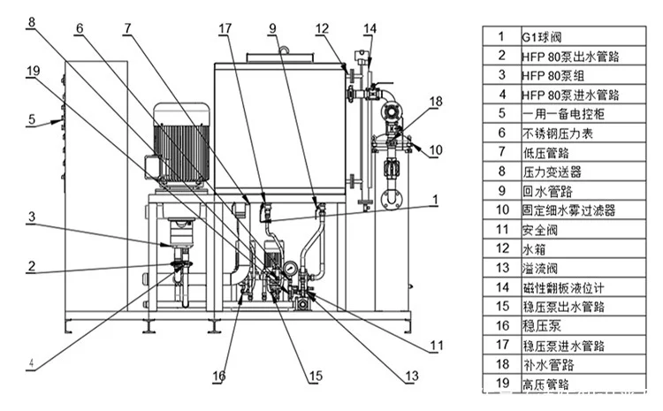 細水霧滅火系統(tǒng)由高壓主泵、備用泵、穩(wěn)壓泵、電磁閥、過濾器、泵控制柜、水箱組件、供水管網(wǎng)、區(qū)域閥箱組件、高壓細水霧噴頭及火災報警控制系統(tǒng)及補水泵等部件組成。