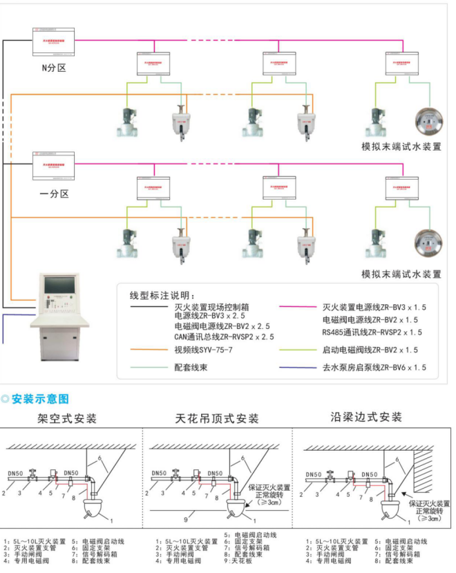 智能消防水炮、電磁閥線纜分別接在圖中對應位置;右側開閥反饋接信號模塊(輸入模塊)9、10號端子,信號總線接模塊2、4號端子;遠程控制線接左下角中控485位置,與遠程手動控制盤自帶線對接;本系統(tǒng)區(qū)域控制箱最多同時控制4臺水炮,在控制多臺時,應注意電磁閥序號與水炮炮號對應。